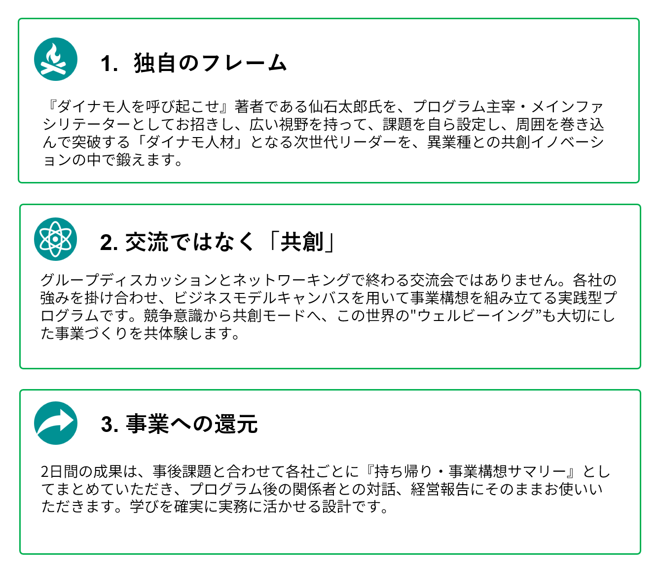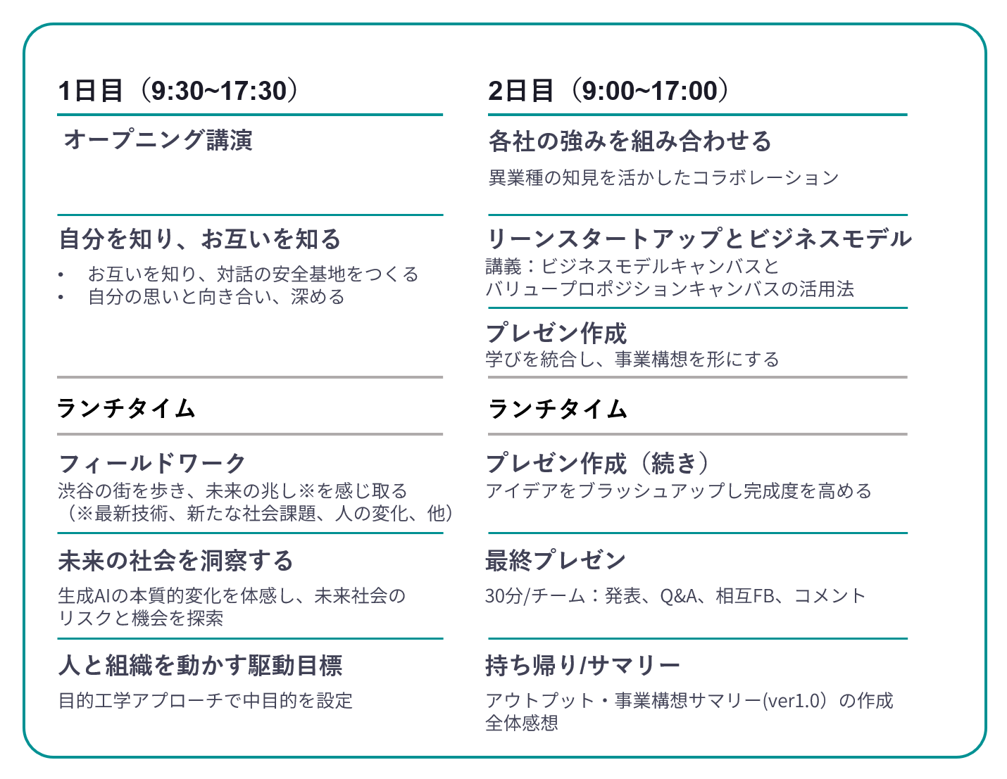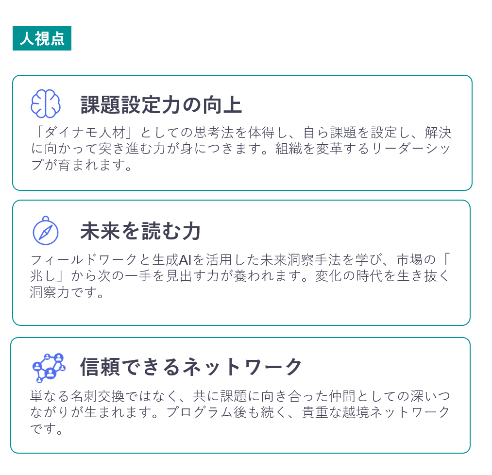 2日間の集中プログラムを通じて、未来を創造するリーダーとしての視点とスキルを身につけ、理論と実践を組み合わせた体験型学習で、確実に成果を生み出します。