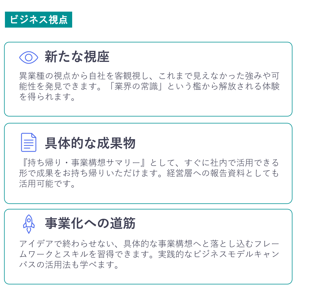 一方で、異業種の視点が入った瞬間、思考の前提が崩れ、新たな可能性が開けます。本プログラムは、単なる「異業種交流」でも「次世代リーダー研修」でもありません。貴社の事業仮説や戦略オプションを、異業種の次世代リーダーたちと共に、一度解体し、「再構築」する、2日間の事業共創ラボです。